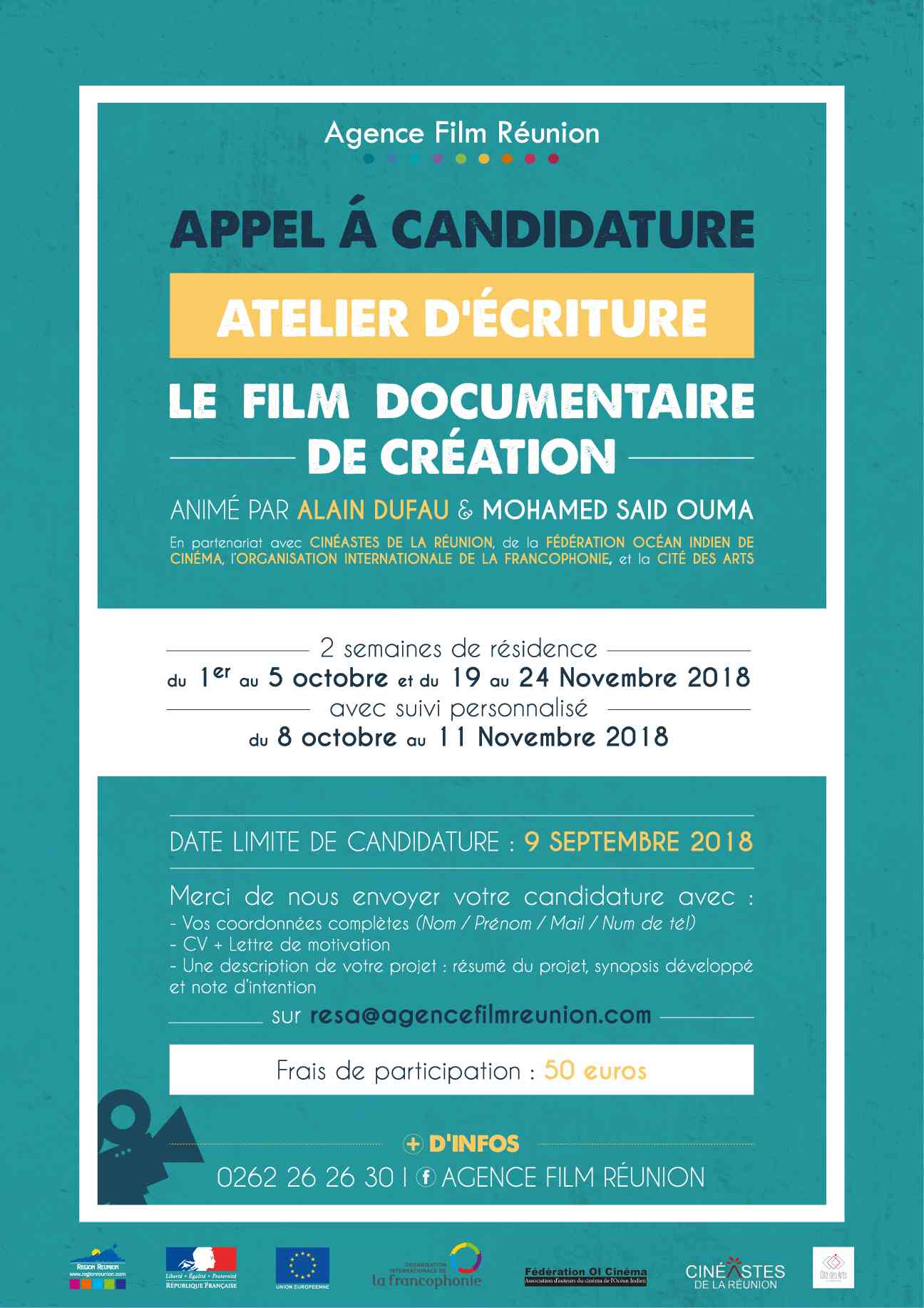 L'Agence Film Réunion organise un Atelier d'écriture, consacré au film documentaire de création, en partenariat avec Cinéastes de la Réunion, la Fédération Océan Indien de Cinéma, l'Organisation Internationale de la Francophonie et la Cité des Arts. Alain Dufau et Mohamed Saïd Ouma en seront les formateurs. La résidence se tient sur deux semaines distantes : du 1er au 05 octobre 2018 et du 19 au 24 novembre 2018, avec un suivi personnalisé du 08 octobre au 11 novembre 2018.