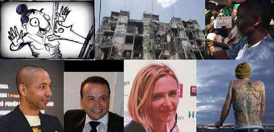 Photo-montage : Les films "Khaldi bahija", "Le building blanc", "Le bonnet de Modibo" et "L'homme qui avait vendu sa peau", les réalisateurs Philippe Lacôte et Anis Lassoued et la réalisatrice Hinde Boujemaa.