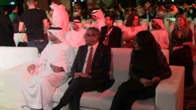 Illustration : Yousri Nasrallah (au milieu des officiels) lors de la cérémonie de clôture du GFF / Photo © Michel AMARGER. Dubaï, avril 2013