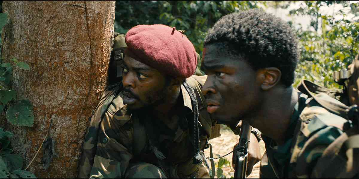 Image : scène du film La Miséricorde de la jungle (The Mercy of the Jungle) de Joël Karekezi, avec les acteurs Marc Zinga (en bérêt rouge) et Stéphane Bak.