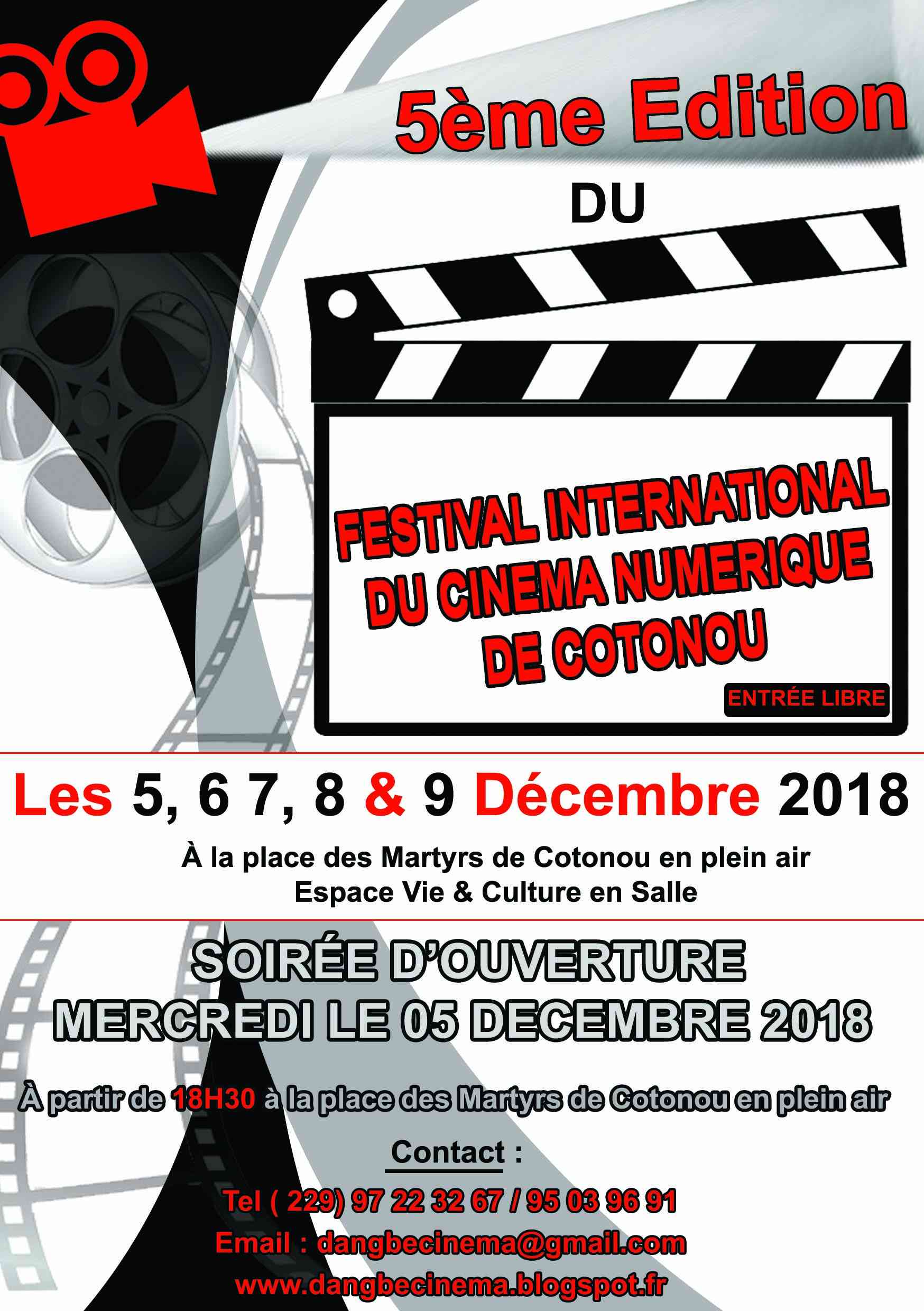 La 5ème édition du FESTIVAL INTERNATIONAL DU CINÉMA NUMÉRIQUE DE COTONOU (FICNC) se tient du 05 au 09 Décembre 2018, à la Place des Martyrs, à Cotonou, la capitale béninoise. Vingt-six films sont en sélection, réalisés par des talents venant de nombreux pays : Togo, Sénégal, Iran, Mali, Espagne, France, Etats-Unis (Like dolls, I'll rise, de Nora Philippe), Allemagne, Suisse, Argentine (Alegria, de Katalin Egely) et bien sûr Bénin. La production varie du court au long et du documentaire à la fiction, en passant par l'animation. Polycarpe Bonfils TCHIAKPE est le directeur du Festival.