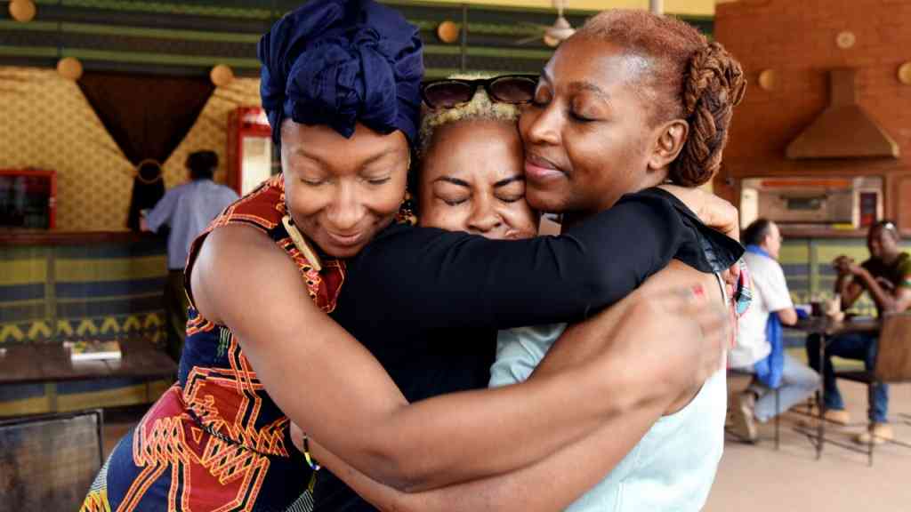 Crédit photo : Issouf Sanogo, AFP: Les actrices Nadège Beausson-Diagne et Azata Soro et la réalisatrice Pascale Obolo lors d'un entretien en marge du Fespaco le 28 février.