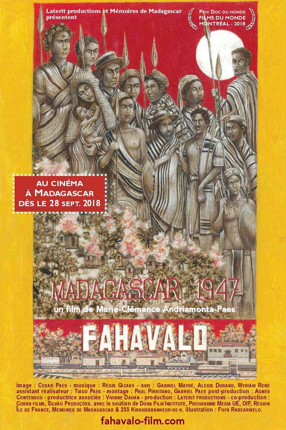 Pour sa Première Mondiale, au festival canadien Films du monde de Montréal - 2018, FAHAVALO, Madagascar 1947, a raflé le Prix Doc du Monde. Le long métrage réalisé par Marie-Clémence Andriamonta-Paes (90min - Madagascar/France - DCP 5.1) fait sa sortie nationale à Madagascar, l'île rouge, à partir du 28 septembre 2018. La production du film a bénéficié du soutien du Fonds Image de la Francophonie (OIF).